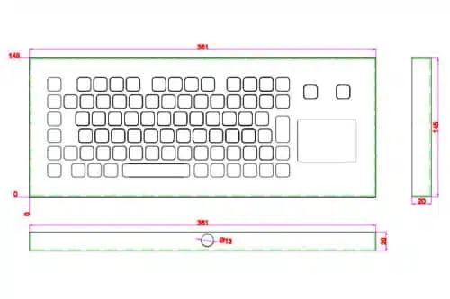 Mit Abmessungen von 361 × 145 × 20 mm bietet die Tastatur eine kompakte, ergonomische und zugleich äußerst robuste Eingabelösung. Das integrierte Touchpad ermöglicht eine präzise Maussteuerung direkt über die Tastatur – ideal für Anwendungen, bei denen kein separates Eingabegerät verwendet werden soll.