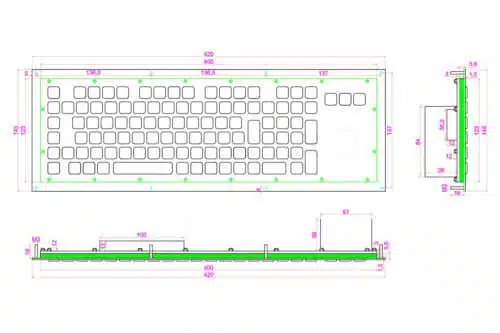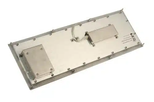 Mit ihren Abmessungen von 420 × 125 mm bietet sie ausreichend Fläche für Funktionstasten, Steuerfelder und den Trackball. Die Tastatur nutzt präzise gefertigte Edelstahltasten mit einem Schaltweg von 1,5 mm und einer Betätigungskraft von 1,5 N ± 0,2 N. Die Beschriftung erfolgt per Lasergravur oder Ätzung und bleibt auch bei intensiver Beanspruchung dauerhaft lesbar.