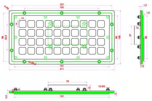 Ultraflache Metalltastatur NHKT-B191-UT-DWP für den Rückwandeinbau aus Edelstahl – 40 Tasten, IP65, vandalismussicher & optional beleuchtet.