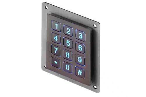 Metalltastatur NHKT-B48-12KP-AC-DWP – robuste Edelstahl-Tastatur mit 12 Tasten, optionaler LED-Hinterleuchtung und IP65-Schutz. USB, PS2 oder RS232-Anschluss.