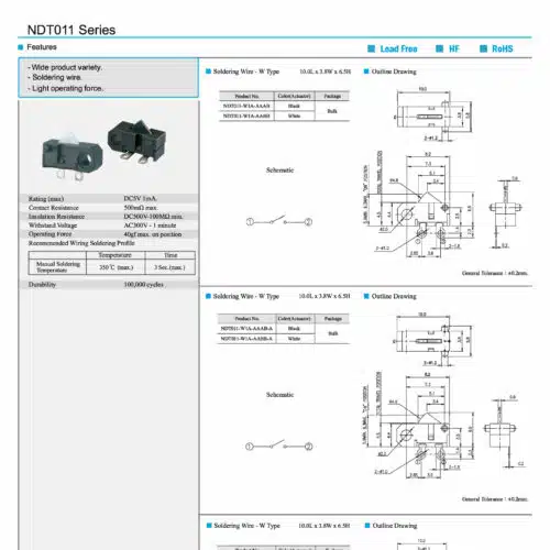 Der Detect Switch aus unserer Serie NDT011 (NDT011-W1A-AABB-D) steht für präzises Schalten auf engstem Raum. Dank seiner kompakten Abmessungen und langlebigen Bauweise ist dieser Mikrotaster die ideale Wahl für anspruchsvolle Elektronikanwendungen in der Industrie, im Automotive- oder Medizinbereich.