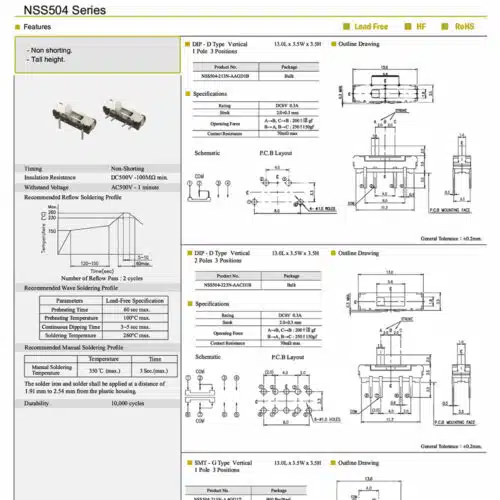 Der Slide Switch aus unserer Serie NSS504 (NTC001-BA1G-B160T) steht für präzises Schalten auf engstem Raum. Dank seiner kompakten Abmessungen und langlebigen Bauweise ist dieser Mikrotaster die ideale Wahl für anspruchsvolle Elektronikanwendungen in der Industrie, im Automotive- oder Medizinbereich.