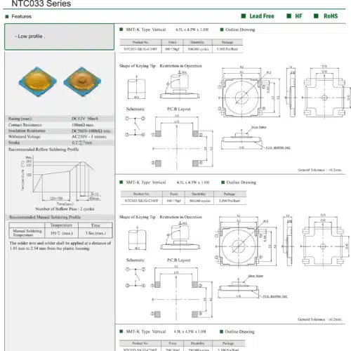 Der Tact Switch aus unserer Serie NTC033 (NTC033-XK1G-C160T) steht für präzises Schalten auf engstem Raum. Dank seiner kompakten Abmessungen und langlebigen Bauweise ist dieser Mikrotaster die ideale Wahl für anspruchsvolle Elektronikanwendungen in der Industrie, im Automotive- oder Medizinbereich.