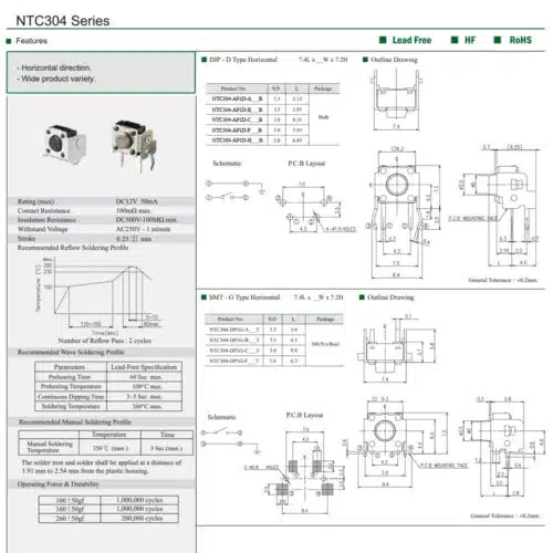 Für die Serienfertigung werden die Mikrotaster auf Rollen (Package: Tape-on-Reel) geliefert, was eine effiziente, automatisierte Bestückung ermöglicht. Auf Wunsch realisieren wir auch kundenspezifische Varianten des NTC304-AP1D-H160B, um spezielle Anforderungen an Kraft, Größe oder Anschlussart zu erfüllen.