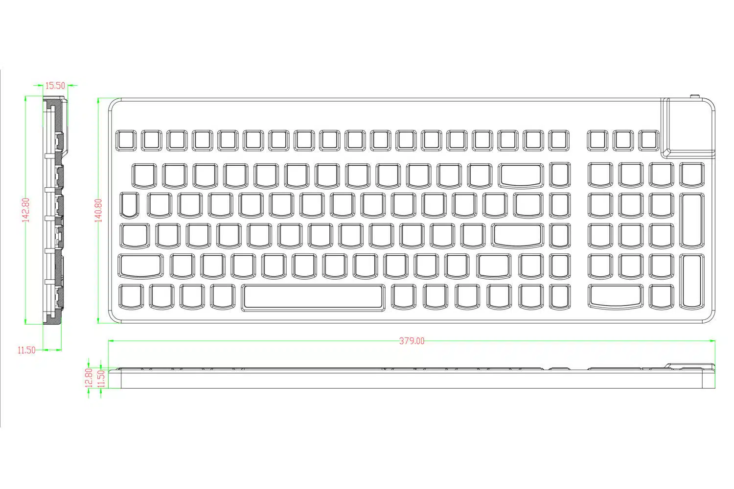 Mit 75 exakt gefertigten Silikontasten, definierter Betätigung und leisem Tastenanschlag bietet sie ein angenehmes Bediengefühl auch bei häufiger Nutzung. Die vollständig geschlossene Oberfläche verhindert das Eindringen von Staub und Flüssigkeiten und die Tastatur ist gemäß IP68 gegen das Eindringen von Staub und zeitweiliges Untertauchen geschützt.