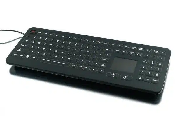 Mit 96 Silikontasten bietet sie eine umfangreiche Eingabelösung. Das integrierte Touchpad ermöglicht präzises Navigieren ohne zusätzliche Maus – besonders praktisch in sterilen oder platzkritischen Umgebungen. Ihre vollständig geschlossene Oberflächenkonstruktion schützt zuverlässig vor Staub und Flüssigkeiten. Die Tastatur entspricht der Schutzklasse IP68, was dauerhaftes Eintauchen ermöglicht, ohne die Funktion zu beeinträchtigen.