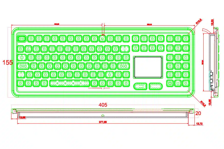 Mit kompakten Abmessungen von 405 × 155 × 20 mm und einem Gewicht von 1,2 kg bietet die NHKT-M399KP-TP-FN eine platzsparende und gleichzeitig robuste Eingabelösung. Der Anschluss erfolgt wahlweise über USB oder PS/2, standardmäßig mit einem 2 m langen Kabel – kundenspezifische Kabellängen sind auf Anfrage möglich.