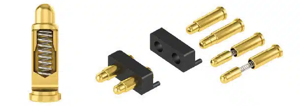 Für Mehrfachverbindungen lassen sich mehrere Federkontaktstifte zu einem Konnektor in einem Kunststoffgehäuse zusammenführen. Diese Federkontakt-Konnektoren sind in Bezug auf Rastermaß, Pin-Anzahl und Gehäuseabmessungen individuell konfigurierbar.
